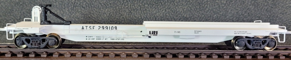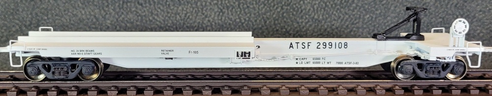 Below: I caught ATSF 299156 from above on Tehachapi Loop, providing crucial info about the deck details. These white cars weathered