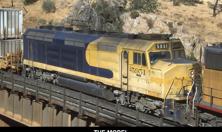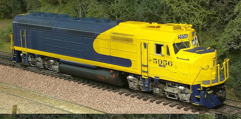 Below: I just copied what M-K had done. Starting from my old Santa Fe SDF45u 5956, I painted over the big yellow Santa Fe lettering