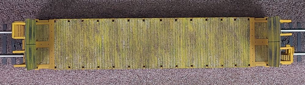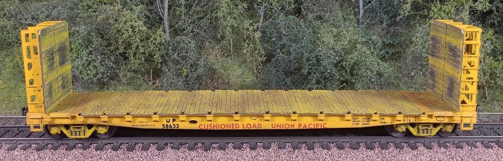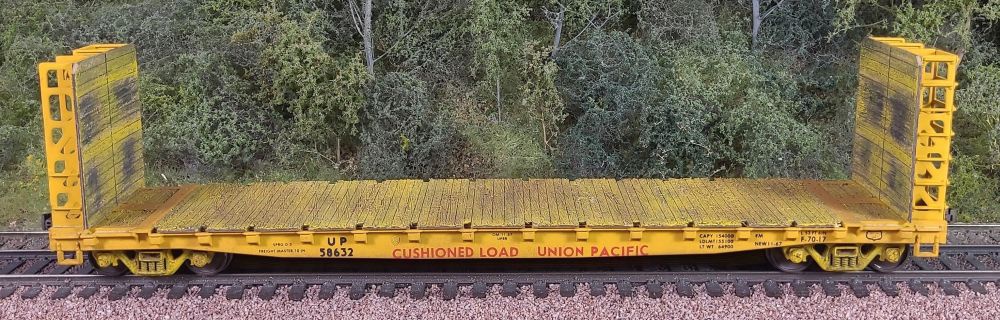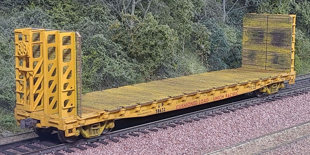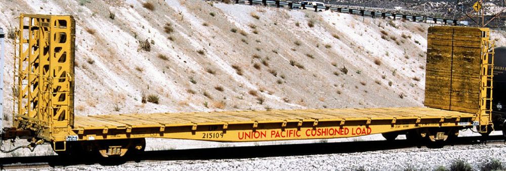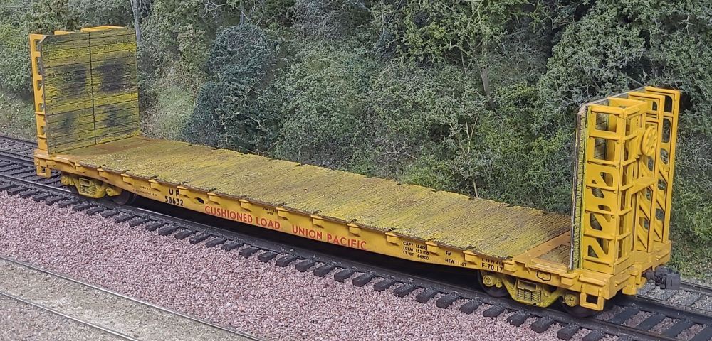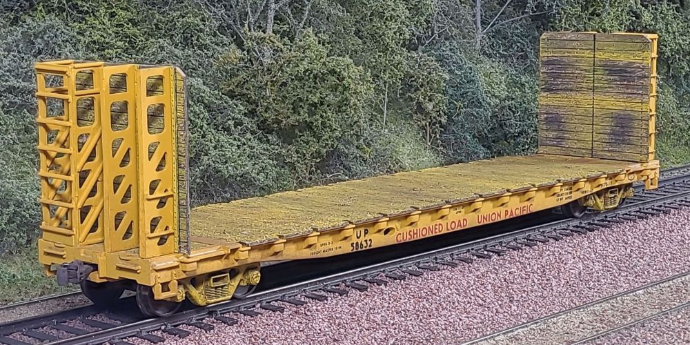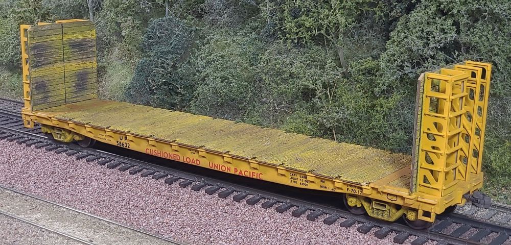 Below: UP 215109 is a close prototype for my model. Note the yellow-painted trucks, deck, and bulkheads with a black centerline.