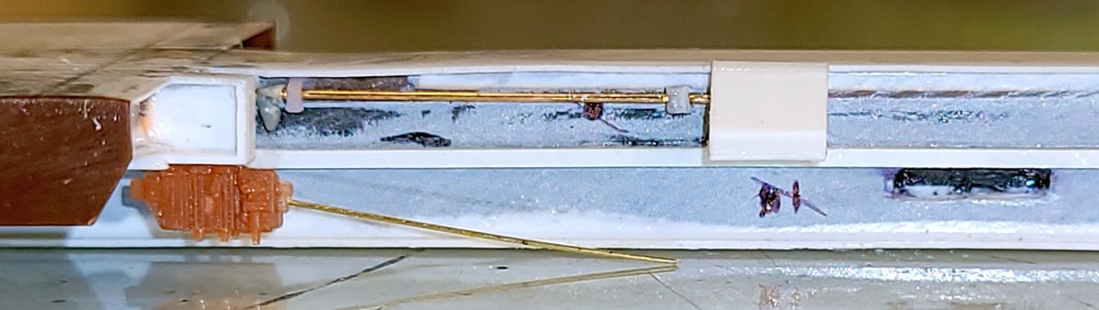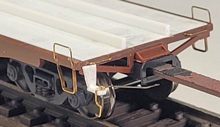 The brake rod supports are flat brass strips bent into loops and inserted into holes drilled into the centersill for strength.