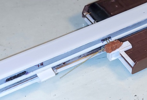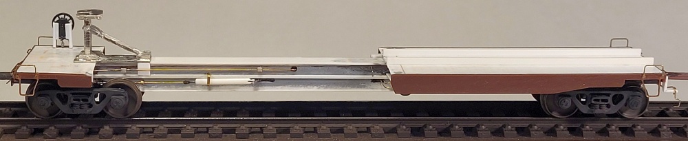 wire conduit running over to the triple valve. I added two fine wire retainer handles, one on each side of the car.