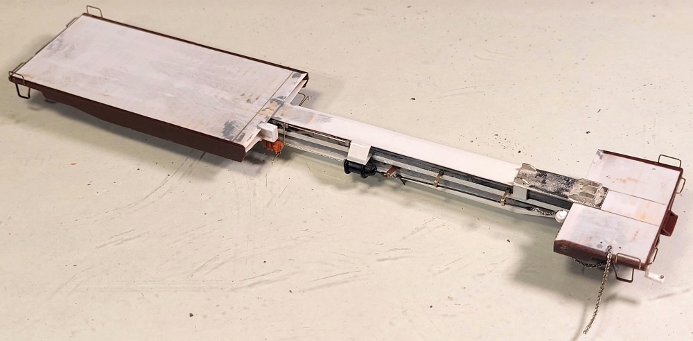 the centersill, and attached the slack adjuster to it. I added sheet lead under the wheel platforms for more weight.