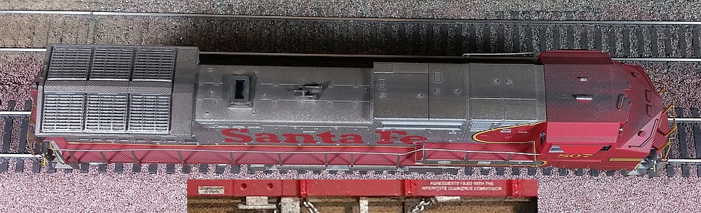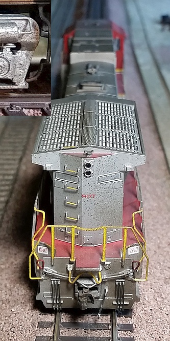 Below: On the cab roof I relocated the main antenna and smaller end-of-train antenna. Exhaust weathering on top