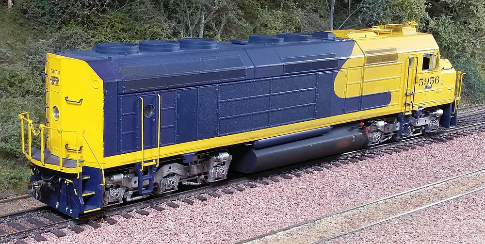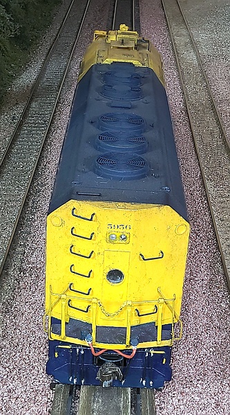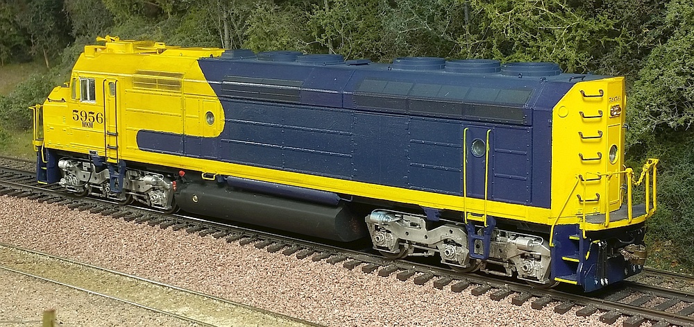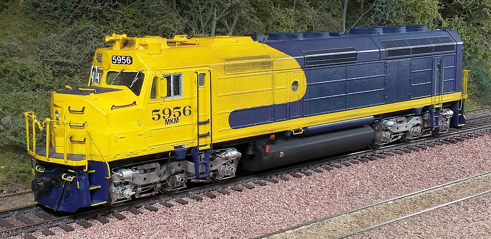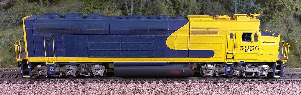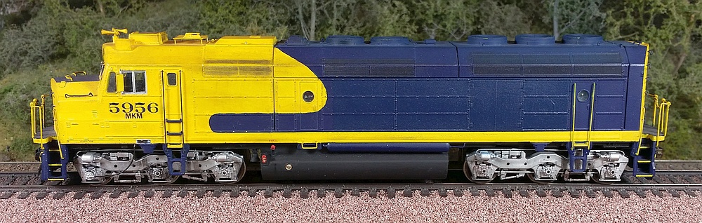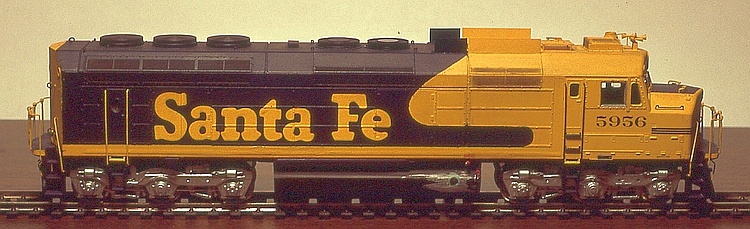 Below: I just copied what M-K had done. Starting from my old Santa Fe SDF45u 5956, I painted over the big yellow Santa Fe lettering