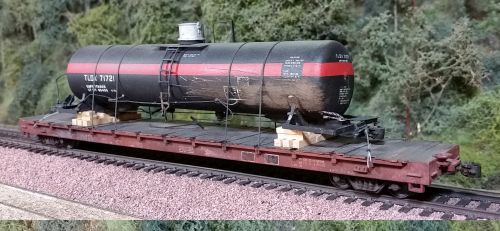 a Roundhouse 60' SP flat car that needed a load. So I worked with the damage on the tank